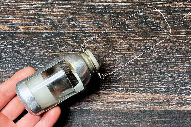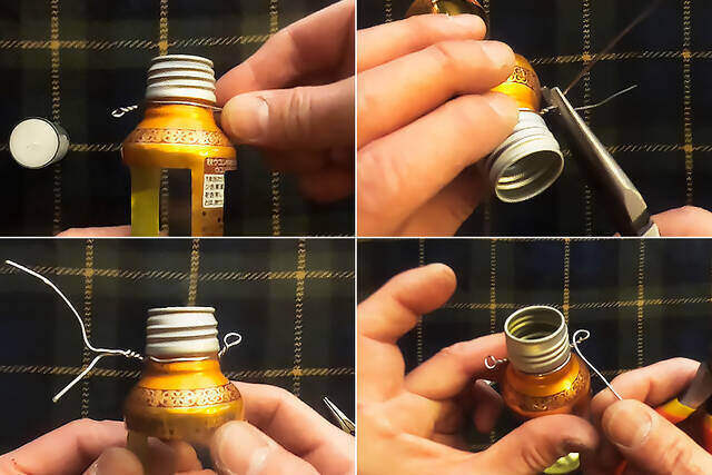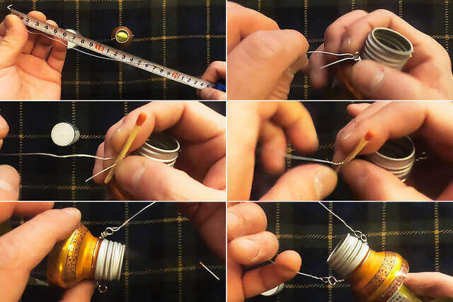 次に、加工した針金を空き缶の首に巻きつけ、反対側をねじって吊り下げパーツを作ります。
