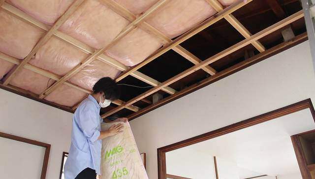 天井を貼る前に断熱材を入れる