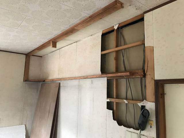 解体する前に一部石膏ボードを取り外し、どうやって固定されているか確認することに。