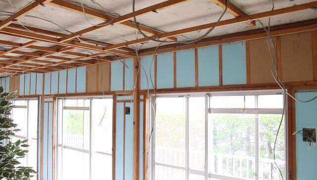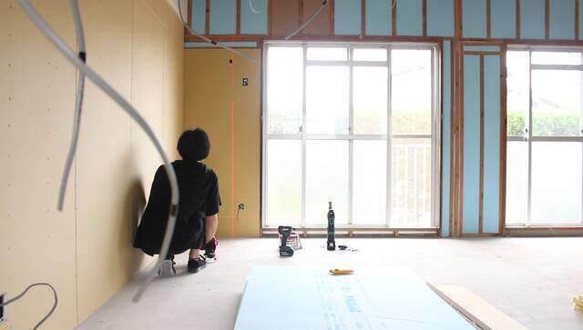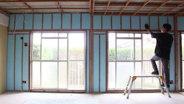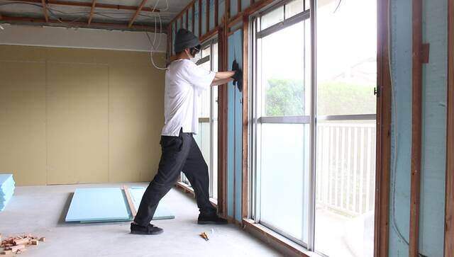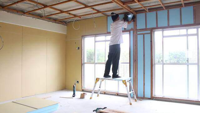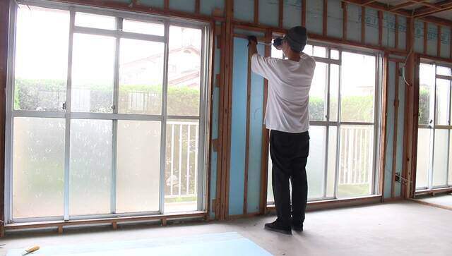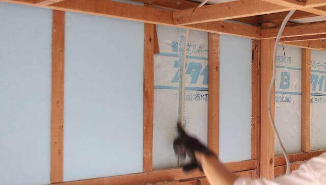 断熱材を埋め込み終わった壁に厚み9.5mmの石膏ボードを張って壁を仕上げます。