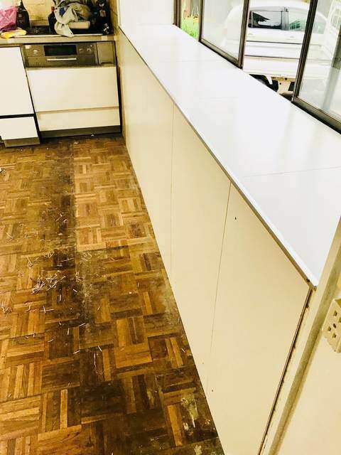 次回は、この部屋一面に白いフロアタイルを貼る作業です!