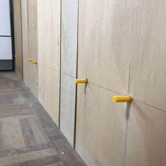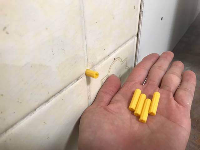 ベニヤ板を貼った部分は、化粧板の固定位置で印をつけ、アンカープラグを差し込んでいます。この写真では先端しか挿していませんが、ここからカナヅチで叩いて、完全にアンカープラグを埋め込みました。