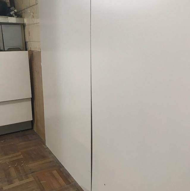 今回はキッチン壁に化粧板を取り付ける過程で、タイル壁の凹凸に悪戦苦闘した様子をご紹介します。
