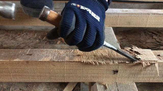 根太と木材の間にノミを入れて削るように引き剥がします。