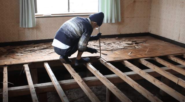 コツコツと根太にバールを差し込んで引き剥がしての繰り返し、特に壁際は硬く、根気のいる作業です。