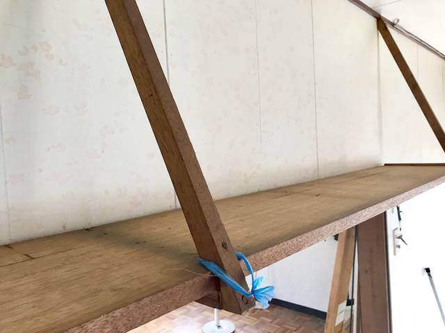 壁を解体する前に、吊り下げられている棚を撤去しないといけません。