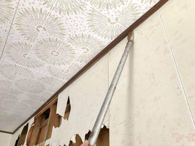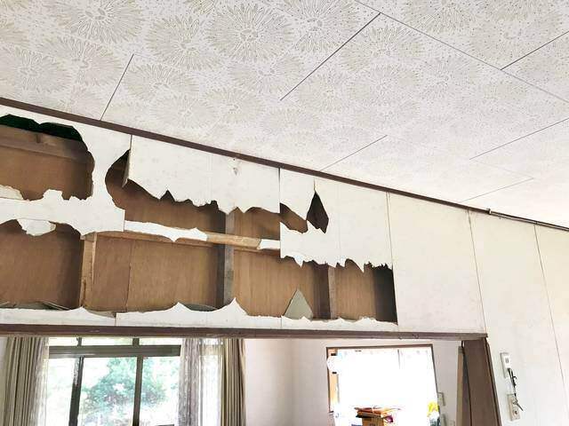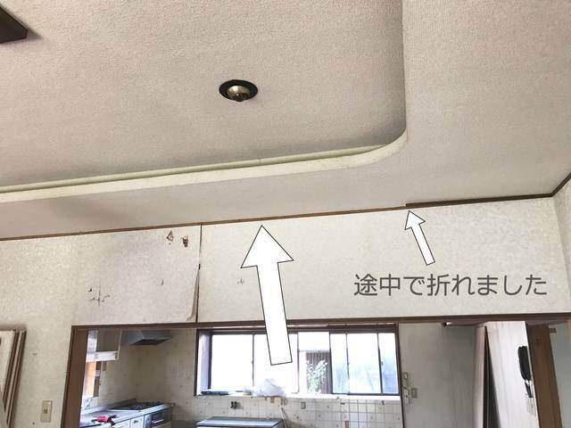 ここで問題が発生。天井と壁の境目についている木材が折れそうな状態になっています。