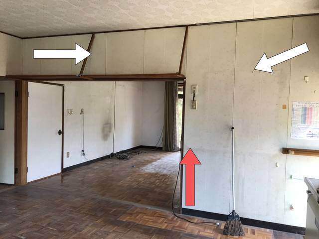 叩いてみて分かったのが、赤い矢印部分は音が太かったので取り除けない柱が入ってるのかなと想定し、それ以外にも何かあるなという音がするので、そこを避けるように白い矢印部分から解体していきます。