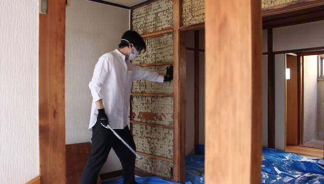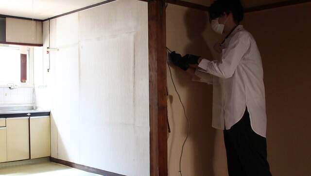 壁の造りを確認してみると、キッチン側はベニヤ板が施工され和室側は砂壁の上に壁紙が貼ってある状態でした。キッチン側の壁は押すと凹むくらい薄い板なので簡単に剥がせそうです。