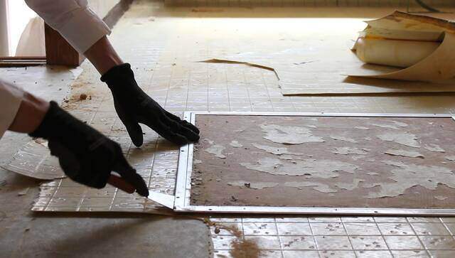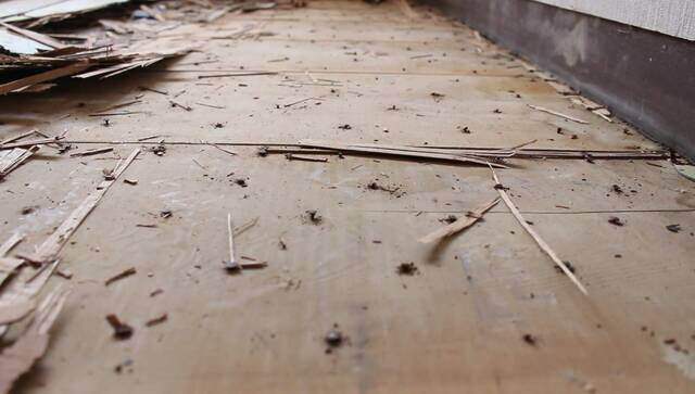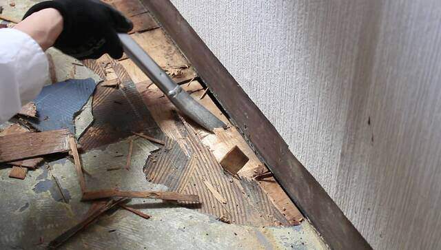 床を剥ぎたいのですが、根太がどこにあるか分からないので、端の傷んでいる所から解体します。
