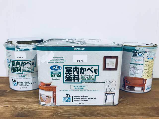 写真はホームセンターで購入した室内壁用ペンキ「カンペハピオ」です。