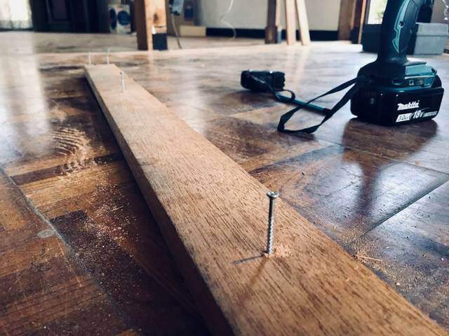 等間隔になっている吊り下げ木を柱にしてキッチン側に少し厚みのある板をビス止めします。