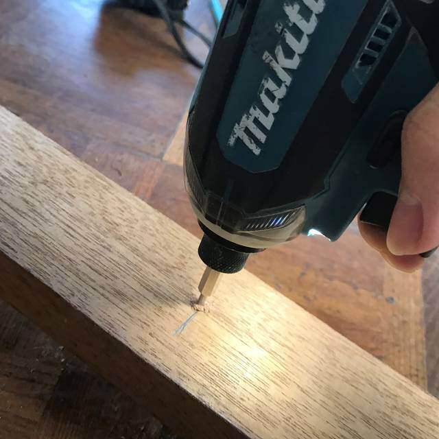 片手で支えながらマキタのインパクトドライバーで直接固定しようと思ったのですが、重すぎて断念・・・仮穴をあけてビスを固定した状態を作ろうと思います。