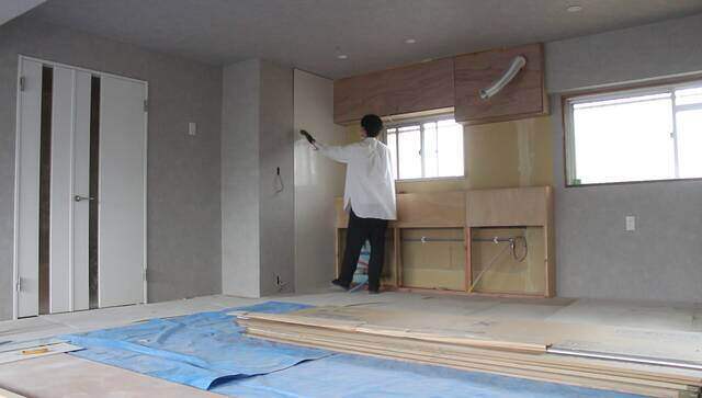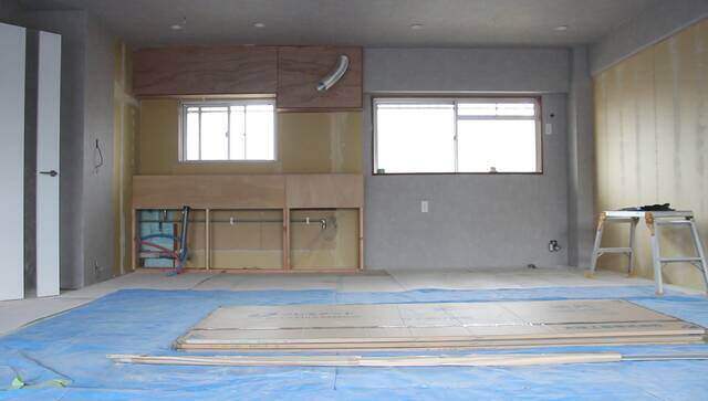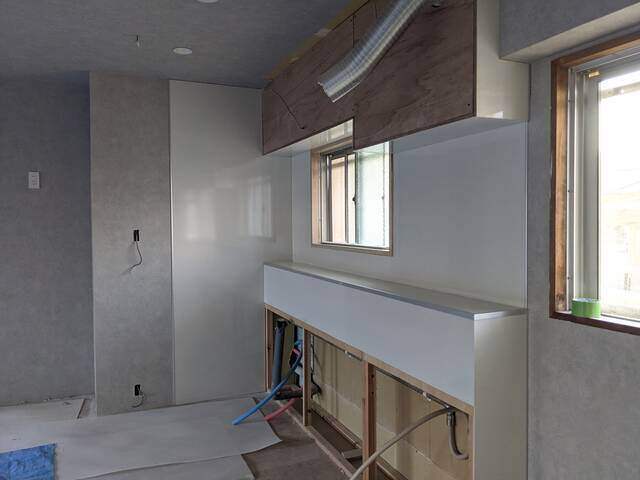 キッチンパネルを貼り付ける壁には壁紙は貼らず、石膏ボードと合板がむき出しの状態にしています。
