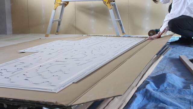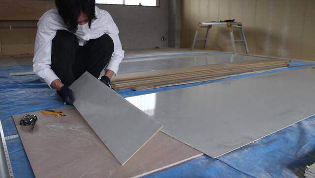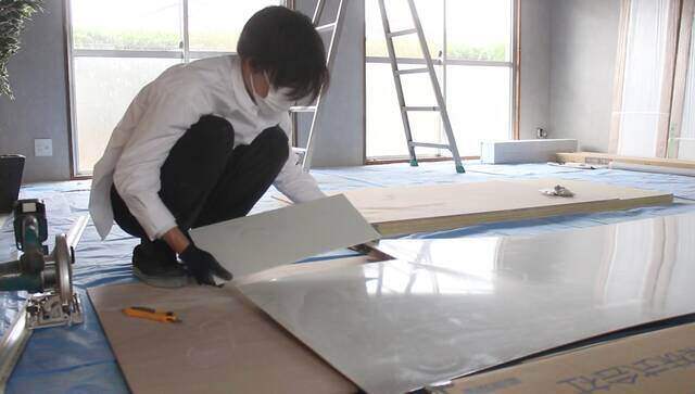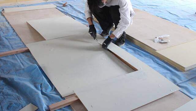※今回のような「切り欠き部」がある場合は長方形のパーツに分けて貼った方が、クラック発生を防ぐことができるそうです。