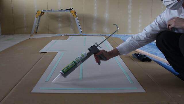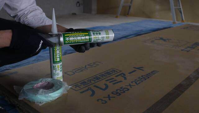 キッチンパネルの貼り付けには専用ボンドと両面テープを使用します。