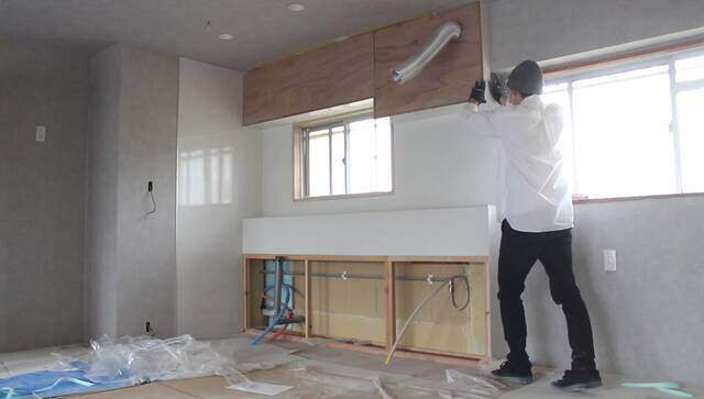 給水管やガス管を隠す為に造作した受け部分は、キッチン天板の上にくる高さで作ったので、受け部分に張っている合板の位置までキッチンパネルを施工します。