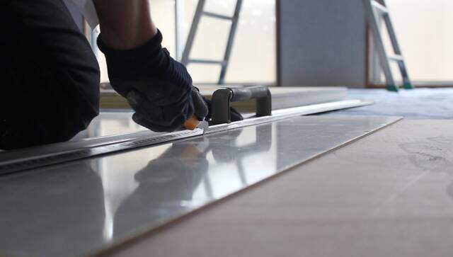 今回使用するシルバーの見切り材はアルミ製なので、サンダーを使ってカット。(プラスチック製の見切り材であればカッターで切れます)