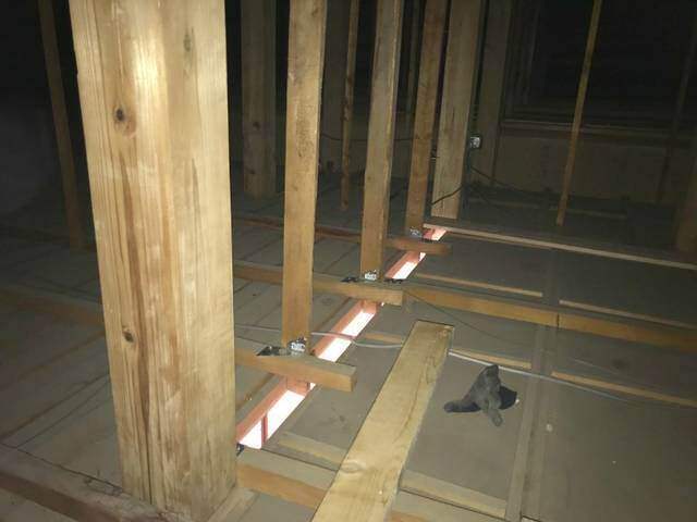 そのまま僕が乗ると天井が簡単に抜けると思われたので、根太に2mくらいの板を敷いて体重が1点に掛からないよう、神経を使いながらの作業になりました。