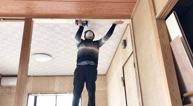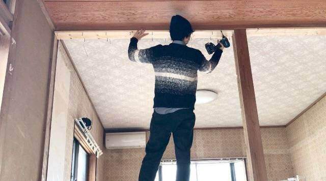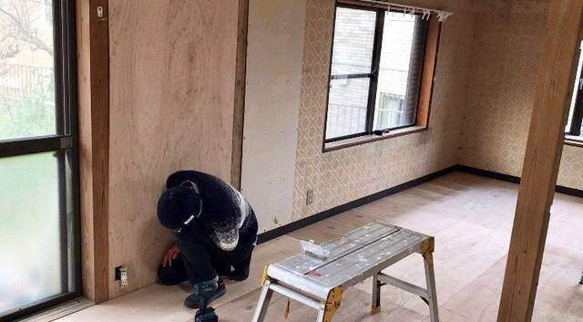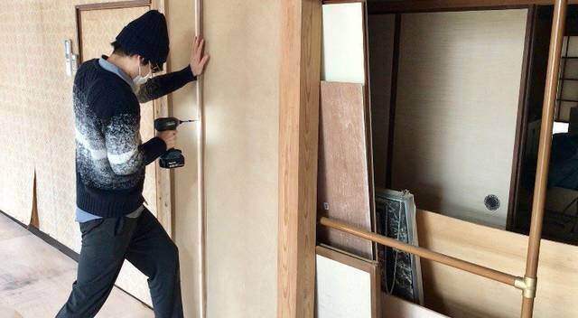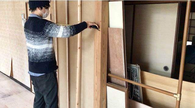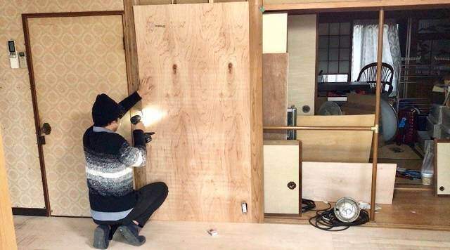 今回は壁を解体してできた隙間の修復と、和室感が残らないよう砂壁の上にベニヤ板を使って壁を作る作業です。