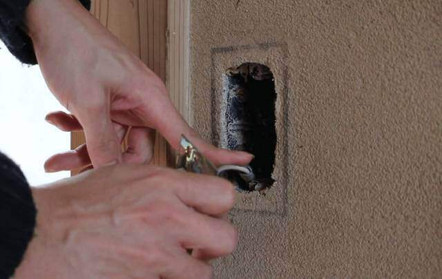 砂壁の上に直接ベニヤ板を張ってしまったらコンセントも隠れてしまうので、間柱を取り付けたらコンセントを外します。(この作業には電気工事士の資格が必要です)