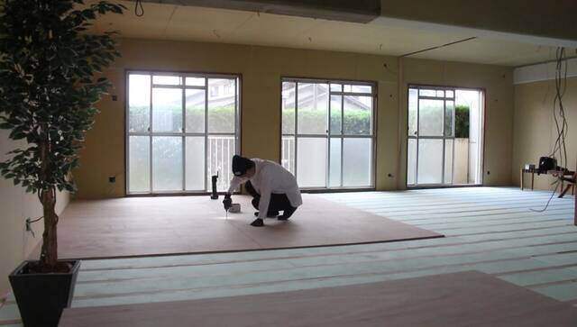今回、段差を無くしたいという点と多少の遮音性を得られる「二重床工法」を採用し施工しました。※この部屋は1階なので遮音性はほぼ気にしていません。