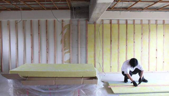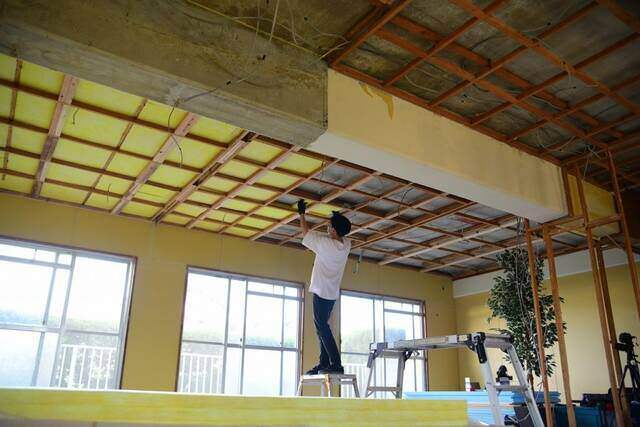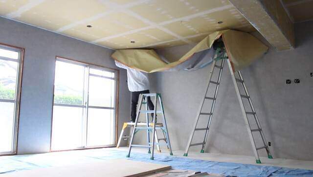 グラスウールを入れ遮音シートを貼り、更にグラスウールを入れて最後に石膏ボードで天井にしました。