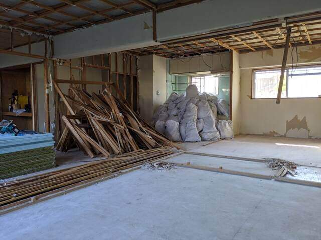 間取りを1LDKに変更、水回りを全て新品に交換するのでスケルトン状態まで解体しました。