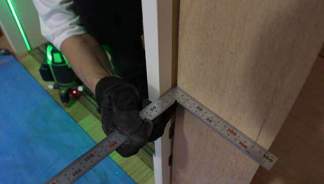 ドア枠が歪んでいるとドアが閉まらないので、レーザー墨出し器で真っ直ぐになっているか確認しながら固定します。(ドアを取り付ける作業で一番大事な箇所です。)