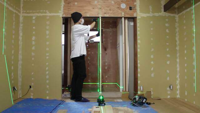(レーザー墨出し器を使って真っ直ぐ固定できているか確認、ここが曲がっているとドアが綺麗に設定できないので大事な作業です)