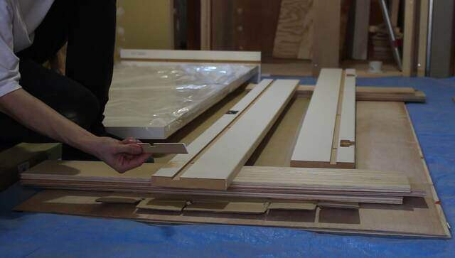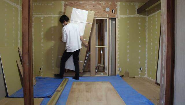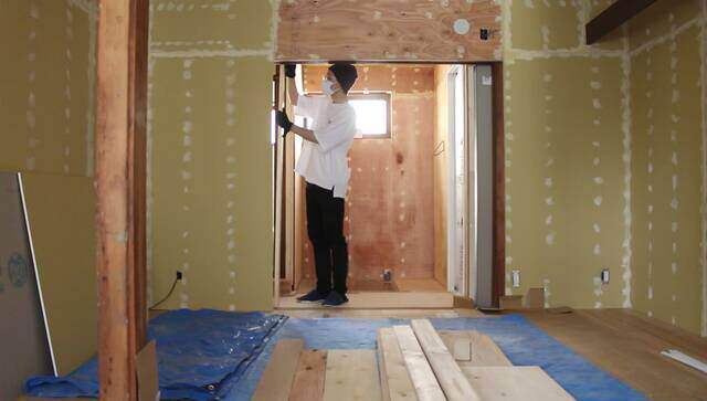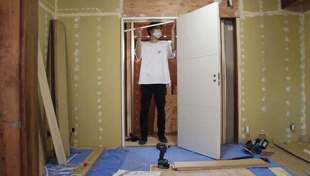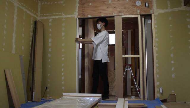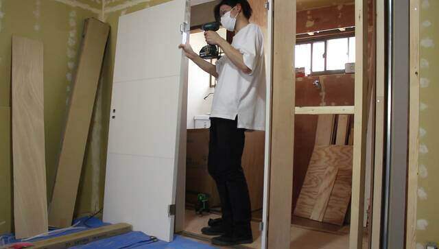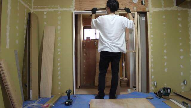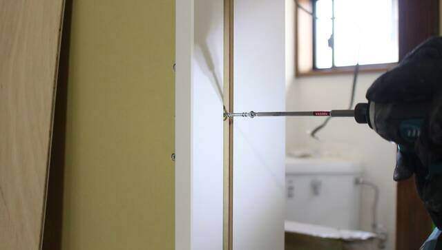 もともと引き戸があった場所を利用して下地を作り、洗面所の入り口に建具を取り付けます。