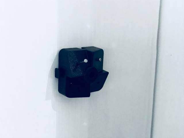 まずはこの留め具を取り付けるための印を、ドアに書いておきます。ボードを当てた状態で、孔からペン先を通す形で書きました。