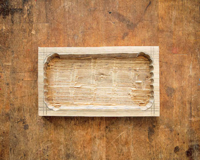 裏返しにして置き、四隅を平ノミで3箇所ずつ削って落としてください。この際、表側にある四隅の円弧とマッチするようにしましょう。
