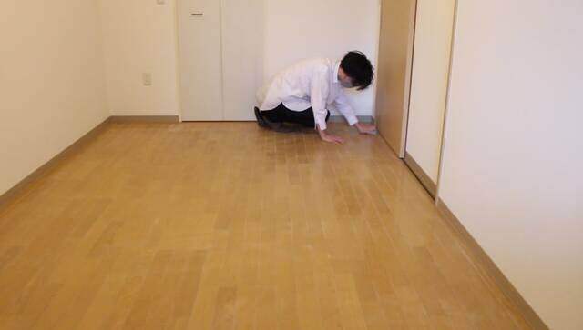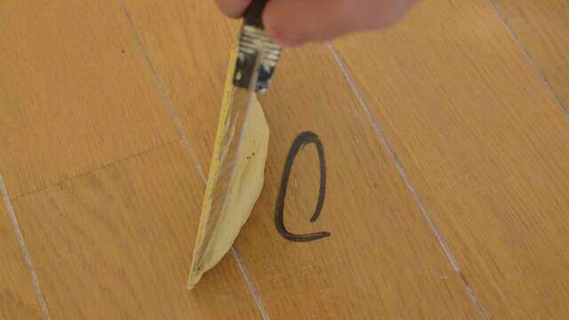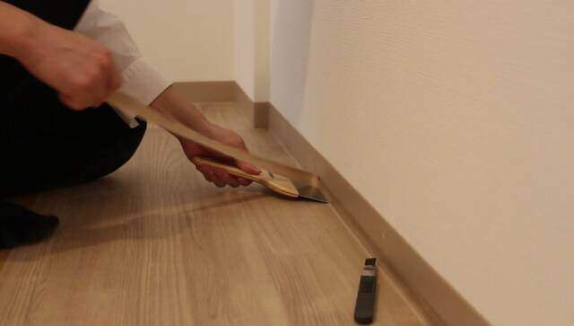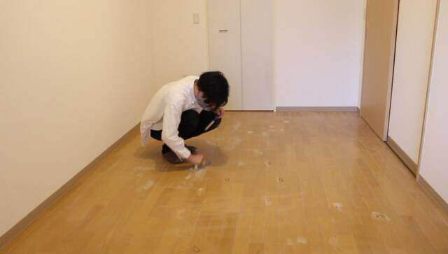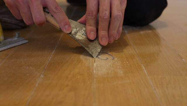 フローリングの溝に沿って爪や竹ヘラで溝を作ります。