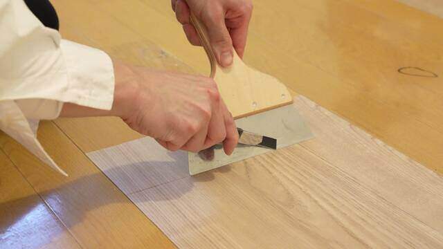 ここでは修復の様子が分かりやすいように、あえて床の色とははっきり違うシートを貼りますが、床の色に合わせてシートを選べば自然に修復できます。補修したいフローリング部分に貼って、フローリングの溝に沿ってカットすれば終わりです。