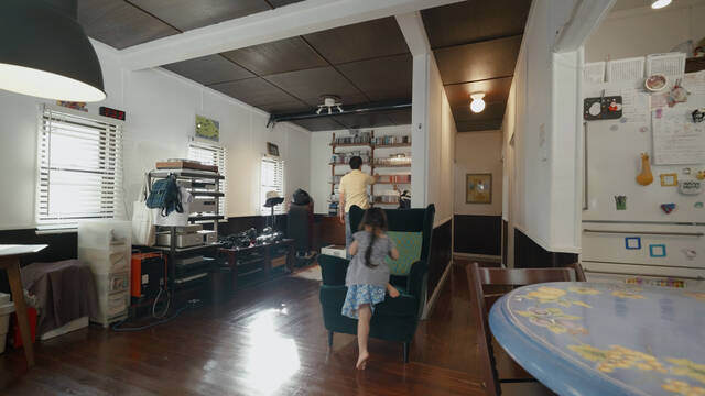 玄関から入ってすぐにダイニングスペースという、あまりみない間取りですが、この生活感がほどよくいい。お子さんが可愛らしいですね。