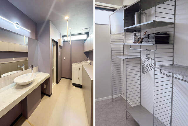 左は、前回の記事でご紹介した木造住宅の浴室ですが、浴室を出た洗面所のスペースに、洗濯機、洗面台の他、家族分の下着やタオル類を収納できる薄型シェルフ(既製品)を設置しています。