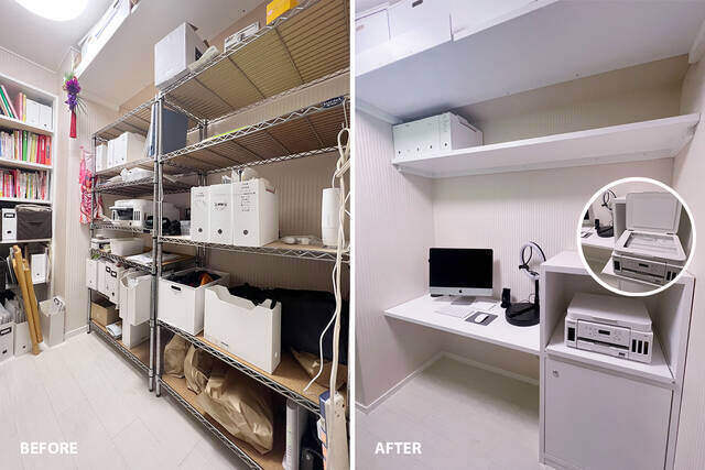 こちらの事例では、これまでスチールラックで整理していた書類や備品などを、スッキリ整理できるよう、棚と机、プリンター収納スペースをオリジナルで造作しました。プリンターは使用時に引き出して使えるほか、その下の棚には、ルーターやコンセント類などを格納できるスペースに。
