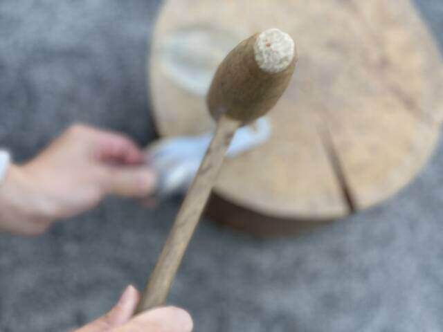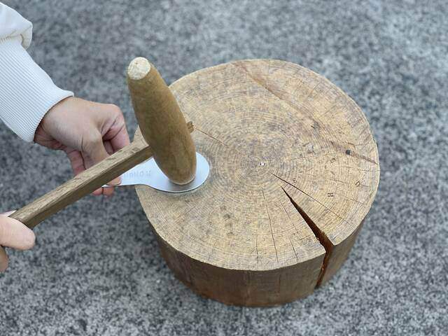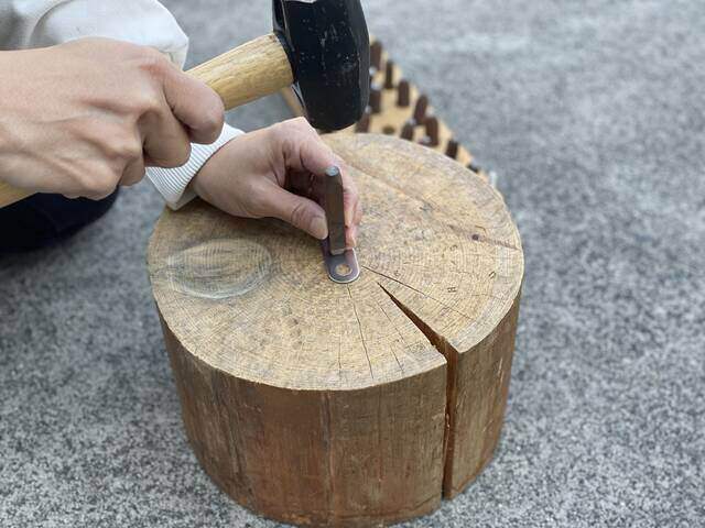 加藤数物の地元である愛知県三河の間伐材でできた木の台を使い材料を凹んだ部分に合わせたら木槌で“トントン”と叩きます。平らな材料が変化していく様子を観察しながら、トントントン…