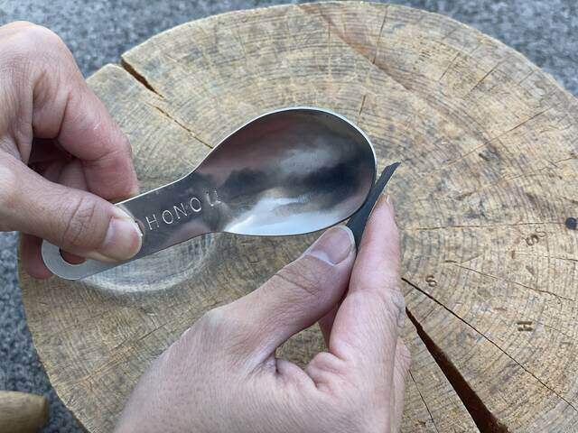ちなみに、実際に使ってみると微調整したくなって作ったスプーンを持ってまた叩きに来る“2度付け”をするお客さまもいます。
