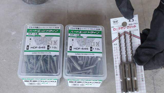 コンクリート壁に木材を固定する為に必要なMakitaの「ハンマドリル」HR2601Fと合わせて、「径4.3のビット」を用意。径4.3ビットに合わせて一回り太い「径5 のコンクリートビス」を用意しました。