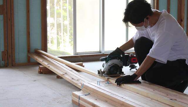 コンクリート壁に固定する板であれば、25mmや20mmの厚みでよかったのですが、リビングと寝室を間仕切る壁用の木材も必要で、分けると費用や管理が面倒だと思い同じ物を大量に発注しました。