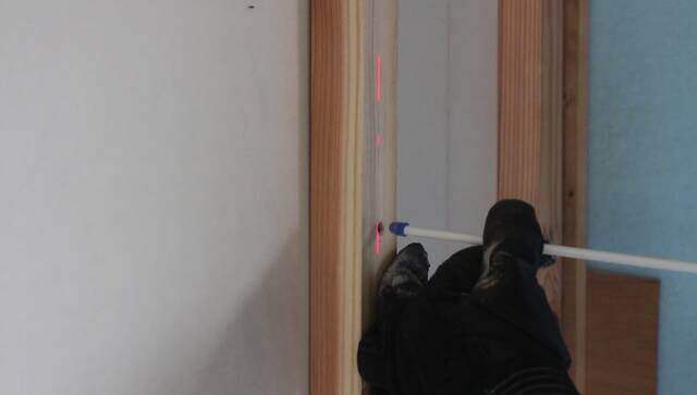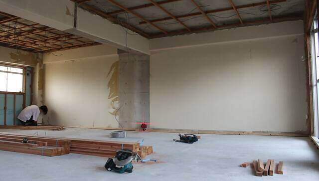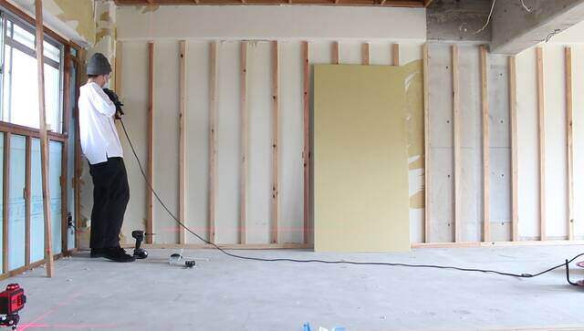 距離を測って木材を固定し石膏ボードを当て、木材を固定しての繰り返しです。