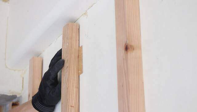 石膏ボードの横幅が910mmなので、300mm間隔で木材を取り付けていきます。
