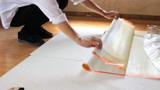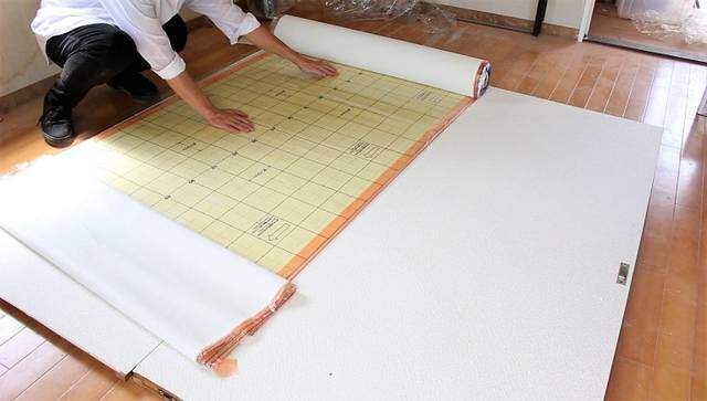 壁の高さが240㎝なので、上下に切りしろ分を追加した260㎝でカットしたら、蛇腹に折りたたんで持ち上げやすくしておきます。