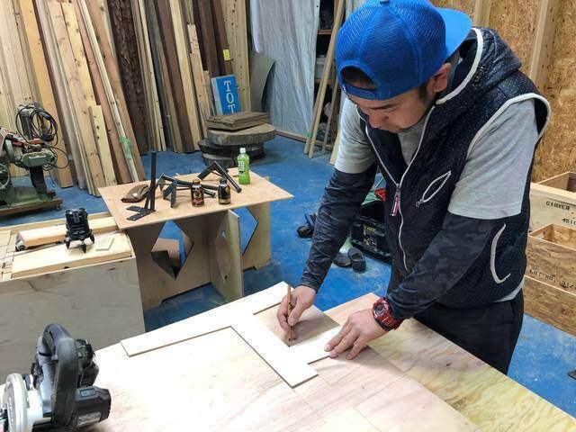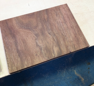 "側板作り。型を取り、ランバーコアを切り抜く"