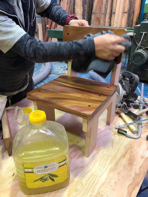 いよいよ仕上げです。再度全体にサンドペーパーをかけ、肌触りを良くします。最後にオリーブオイルを塗り込みます。オリーブオイルを塗ることで、木目がくっくり浮かび上がり味わい深い色目になっていきます。また汚れ防止にもなります。大人でも十分座ることのできる性能なので、座り心地なども最後にチェックして、必要に応じて微調整を行って下さい。