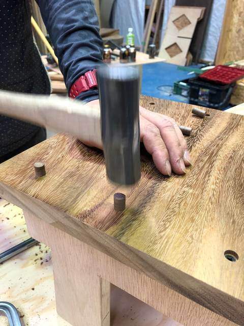 最初の完成品を見ていただければわかる通り、釘の跡を見えないようにするためにダボ加工という技術を使っています。これはくぼみを作って、その中に釘を打ち、最後に木材でフタするという加工です。写真のようにを使い、フタ側の材を用意します。そして、げんのうで打ち込んでいきます。浮き出ている部分は、最後に手ノコで切っていきます。