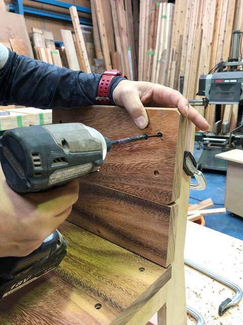 "側板と座板をつなぐ。工具を使用し、側板と座板を密着させる"