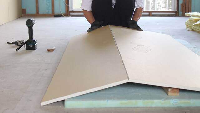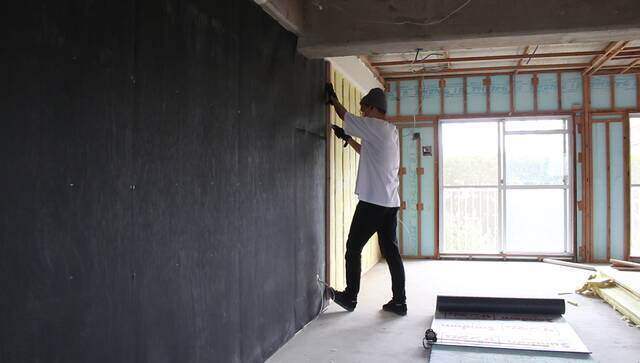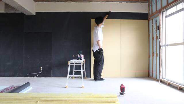 石膏ボードは、遮音シートの境目がズレるように右側から貼っていきます。